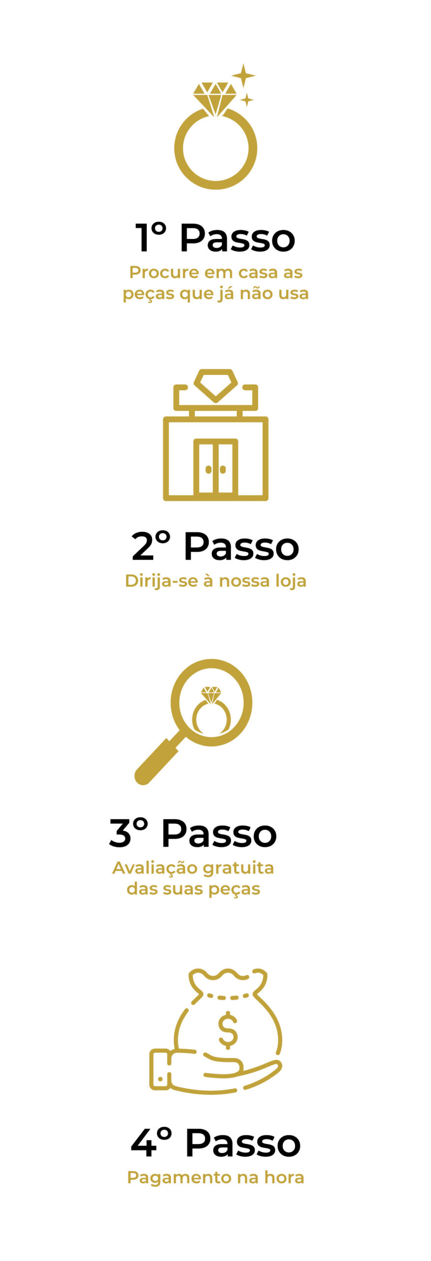 Receba mais pela venda do seu ouro: Fios, cordões, anéis e alianças, pulseiras e braceletes, medalhas, brincos, alfinetes de peito e gravata, relógios e qualquer outro objeto em ouro.